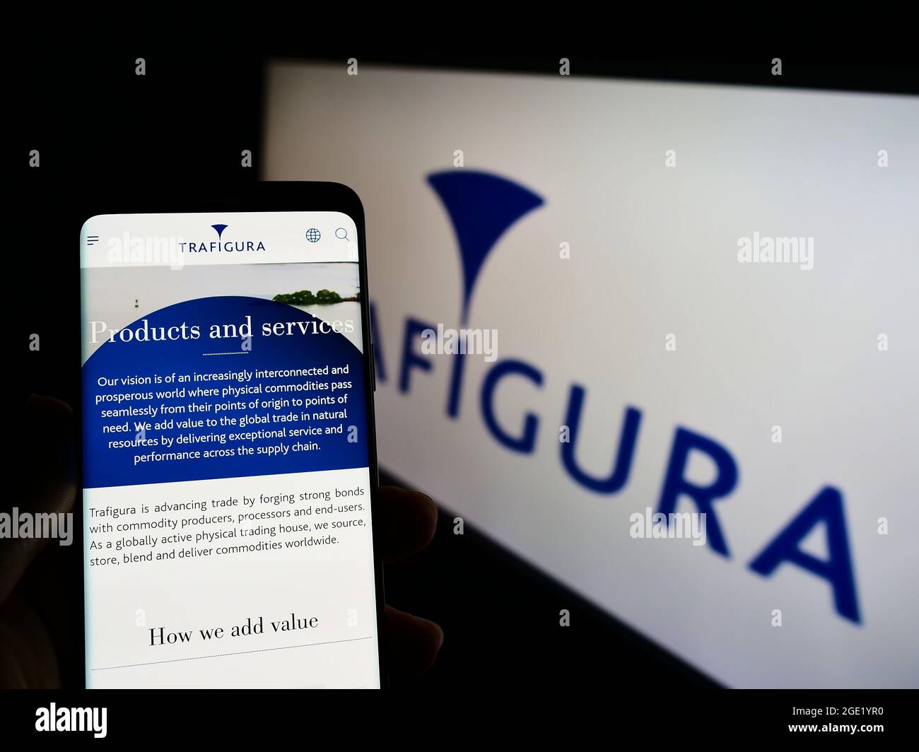Person Die Smartphone Mit Der Webseite Des Rohstoffhandelsunternehmens Trafigura Group Pte Ltd Auf Dem Bildschirm Mit Logo Halt Konzentrieren Sie Sich Auf Die Mitte Des Telefondisplays Stockfotografie Alamy